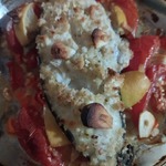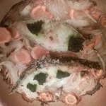 Стейки зубатки слегка разморозить, но не полностью, не нужно, чтобы она превращалась в тряпочку и истекала соком. Пусть она будет ещё твёрденькая. Счистить со шкурки слизь. Посолить, поперчить, посыпать прованскими травами и сбрызнуть соком лимона.