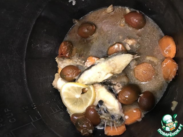 В форму на дно положить кружки моркови, лука, лимон и чеснок. Слегка посолить и полить подсолнечным маслом Олейна.