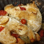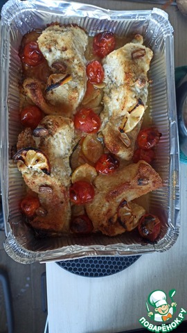Сверху рыбы положить помидоры черри, пару колечек лимона и слайсы чеснока. Лимон посыпать щепоткой сахара. Полить всё подсолнечным маслом Олейна.