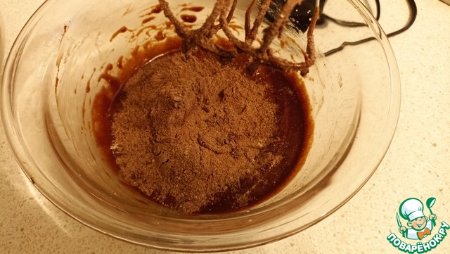 Всё сухие ингредиенты (мука, какао, разрыхлитель и соль) добавляем к жидким в 3 этапа и хорошо размешиваем.