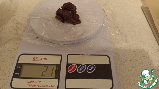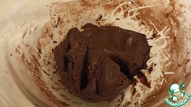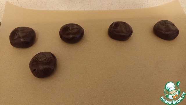 Из шоколадной массы руками формируем шарики, размером с грецкий орех, чтобы печенье было одинаковым вы можете взвешивать каждый кусочек или делить на глаз. Я взвешивала по 21 гр каждый кусочек, можно чуть больше или меньше как вам хочется.