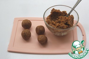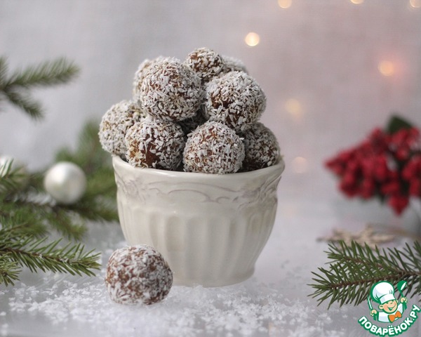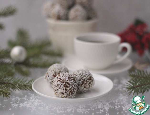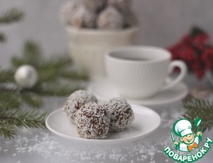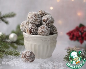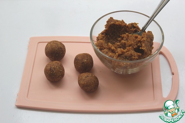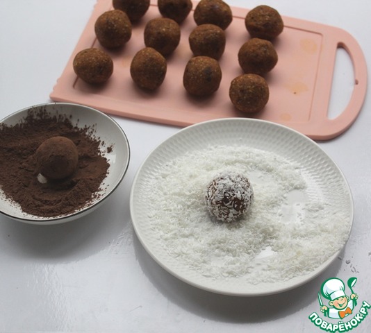Обвалять в кокосовой стружке или в какао, по желанию в измельченных орехах, для цвета можно в чае матча.