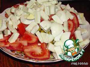 Помидор нарезать не мелко (дольками, а потом ещё пополам).