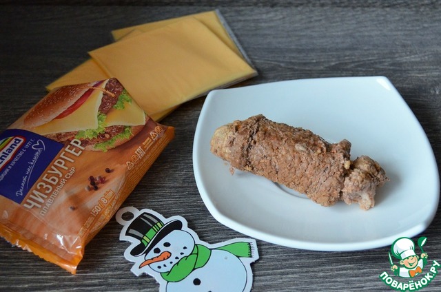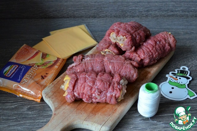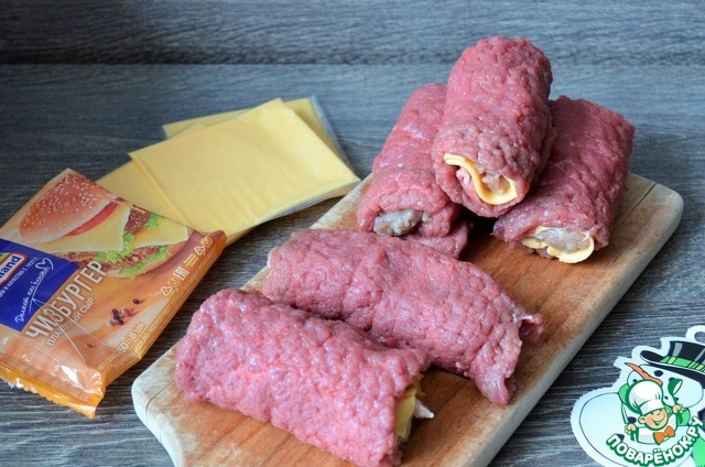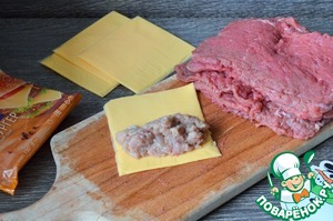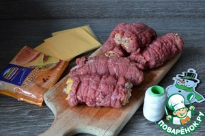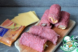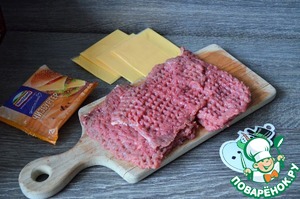 Приготовить продукты, сыр можно взять и другой, главное, в пластинках. Я использую плавленный сыр "Чизбургер" от ТМ Hochland. Говядину нарезать на тонкие, плоские куски.