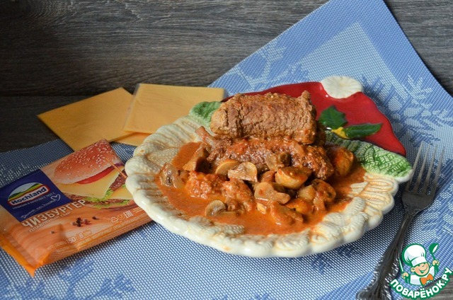 Вкусное горячее, сытное - мякоть говядины с сыром и мясным фаршем, в пикантном соусе - томатный сок и пиво, с шампиньонами и сухими белыми грибами. И гостям подать не стыдно. Обратите внимание на рецепт при выборе блюд праздничного меню.
