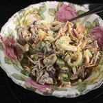 Салаты из кальмаров любят многие. Они всегда украшение праздничного стола. Предлагаю Вам ещё один рецепт этого вкусного блюда.