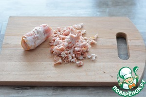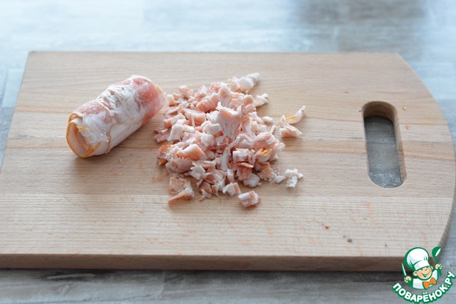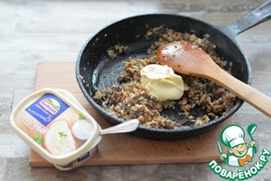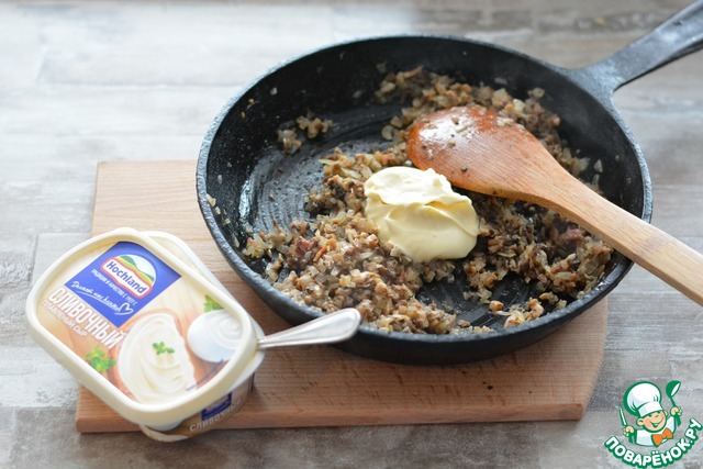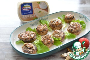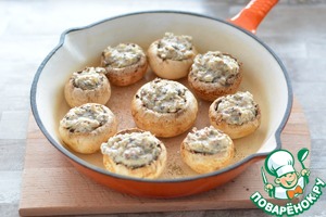 На масле поджарьте мелко нарезанный бекон с мелко нарезанным луком и ножками грибов, снимите с огня, добавьте плавленый сыр и перемешайте. Начинка для шляпок готова