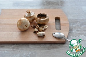 У шампиньонов удалите ножку и чайной ложкой выскребите часть мякоти, нарубите мелко