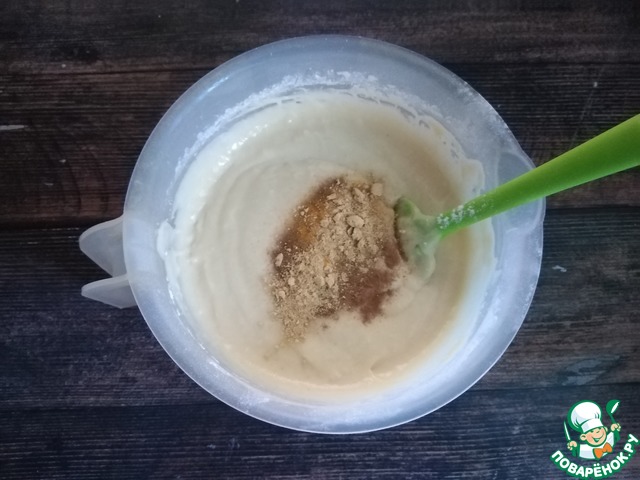 Делаем тесто для кекса. Я буду использовать ручной венчик. В посуду выкладываем сметану, я добавлю ещё немного сыворотки из-под брынзы (это не обязательно, просто она у меня осталась) и кладём разрыхлитель. Соединяем и ждём реакцию. Разбиваем яйца, добавляем сахар, соль, опять всё соединяем. Масло сливочное я растопила в СВЧ 35 секунд при мощности 800. Растопите любым способом. Отправляем масло туда же, соединяем.