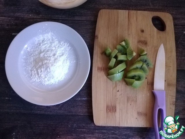 Киви чистим от шкурки и режем на четвертинки, а затем на кусочки не совсем мелкие. Обваливаем тщательно каждый кусочек в крахмале.