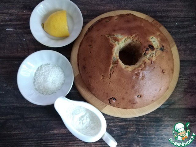 Вынула кекс из духовки. Дала остыть. Извлекла фольгу с рюмкой из центра и сам кекс из формы легко. Пусть остывает ещё, чтобы покрыть его глазурью. Сахарную пудру соединяем с лимонным соком и поливаем кекс.