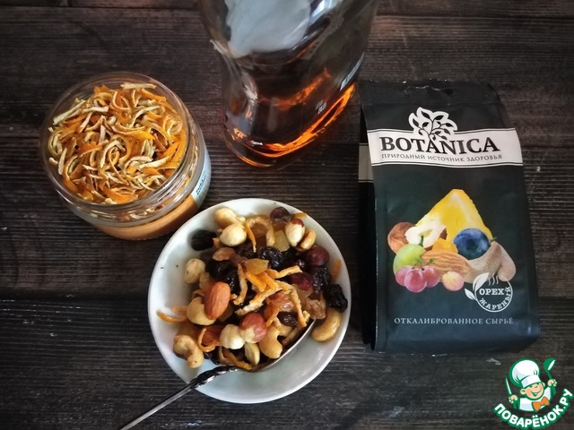 Время приготовления кекса без замачивания орехово-фруктовой смеси и цедры мандарина. Мандариновая цедра у меня заготовка высушенная. Орехово-фруктовую смесь ТМ BOTANIKA + мандариновую цедру я залила коньяком, накрыла и оставила на ночь, чтобы коньяк весь впитался и размочил смесь. Орехи не дробила, оставила целиком.