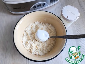 В миску добавить общее количество муки (170 гр.), разрыхлитель (1/2 ч. ложки), соль (1/2 ч. ложки), холодное сливочное масло. Порубить масло и муку в мелкую крошку (можно перетереть руками).