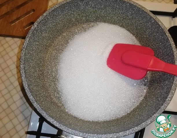 В глубокую сковороду высыпаем сахар плавим на небольшом огне помешивая селиконовой лопаткой.
