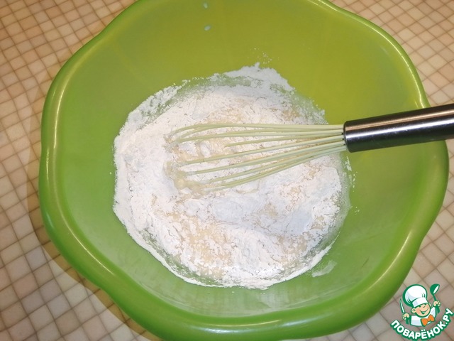 Вливаем молоко, перемешиваем. И постепенно добавляем просеянную муку, перемешанную с разрыхлителем теста.