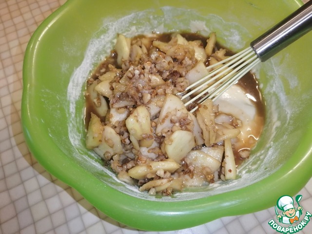 В конце добавляем остывшие яблоки с орехами и очень хорошо всё перемешиваем.