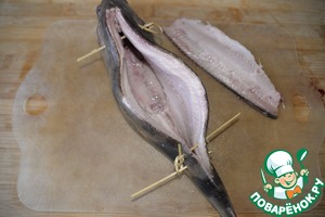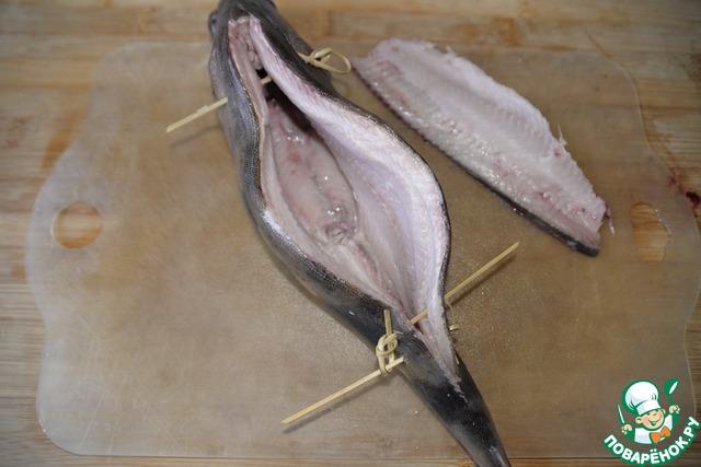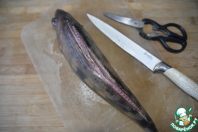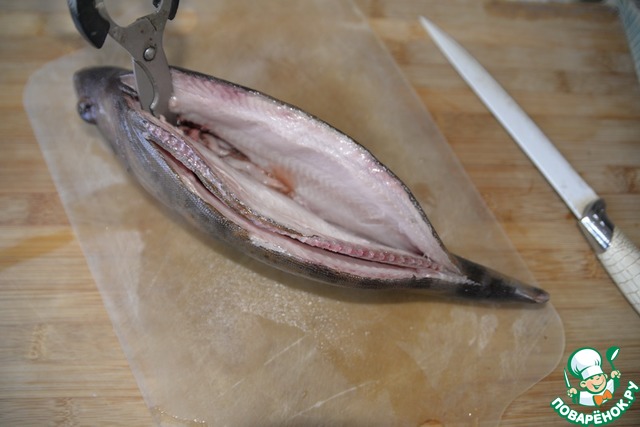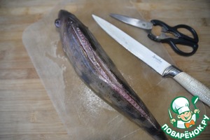 Рыбу чистим, отрезаем плавники, хвост. Удаляем жабры, моем. Нож должен быть очень острым. Делаем глубокие надрезы вдоль хребта.