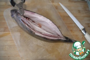 Вырезаем хребет. Помогаем с помощью ножниц, отрезая хребет у головы и хвоста. Удаляем внутренности.