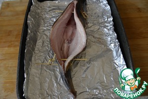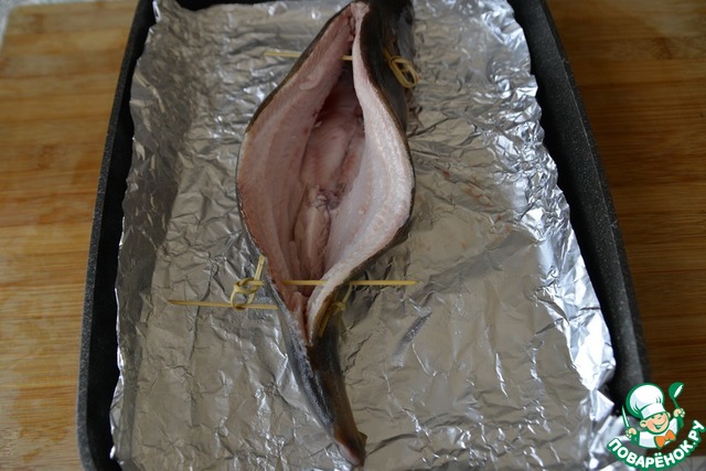 Берём форму, кладём фольгу, смазываем маслом. На фольгу кладём окуня, фиксируем рыбу, смазываем (сбрызгиваем) маслом снаружи. Скрепляем шпажками у головы и хвоста, чтобы рыба не расползалась под тяжестью начинки.