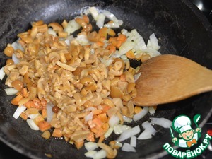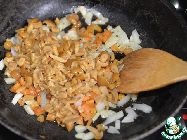 Добавляем порезанные грибы, у меня вареные опята, обжариваем 10 минут.