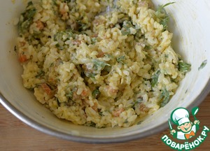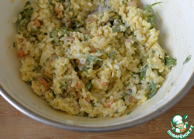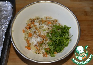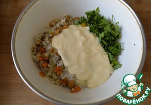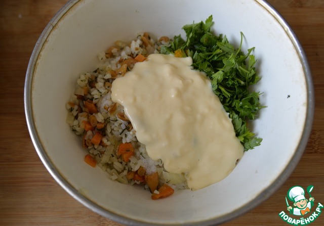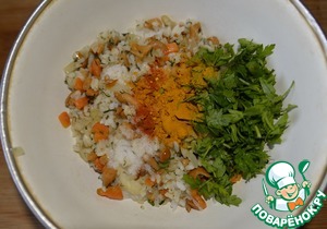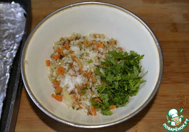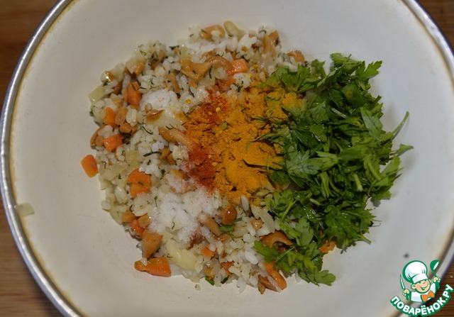 Заранее отвариваем рис до полу-готовности около 15 минут, соединяем рис с грибами. Добавляем рубленую зелень, у меня петрушка.