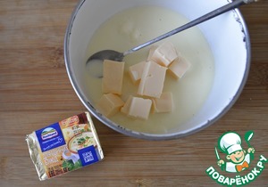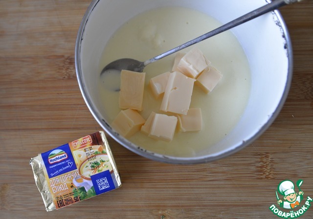 Готовим соус. Смешиваем сливки и порезанный плавленный сыр, у меня сырно-сливочный Hochland для горячих блюд. Нагреваем до растворения сыра в сливках.