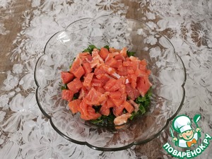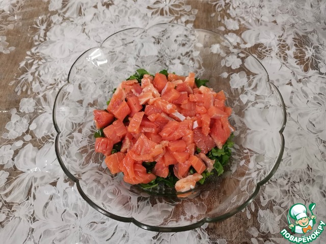Нарезать кусочками сёмгу.