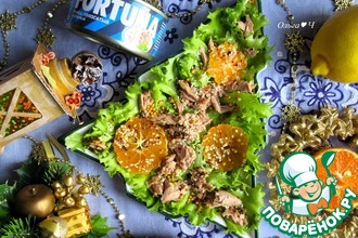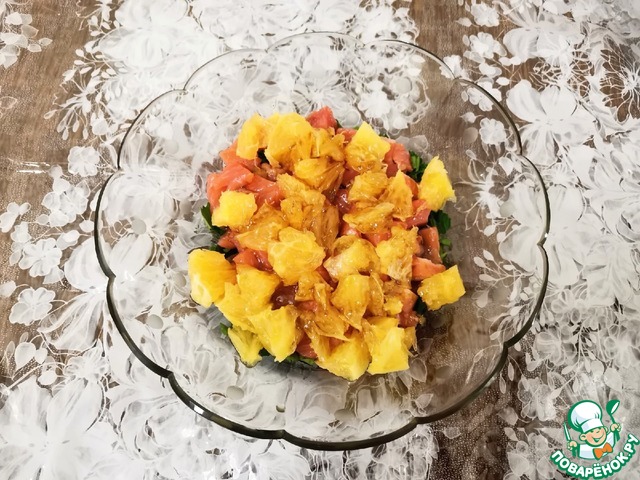Конечно, сочетание продуктов - на любителя. Но у меня этот салатик точно остаётся в рубрике «Надо повторять». Для себя сделала отметку, что лучше его делать за несколько часов до подачи. Тогда соус и сок апельсина пропитают рыбу и зелень.