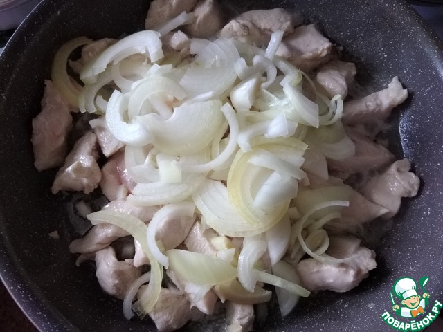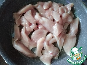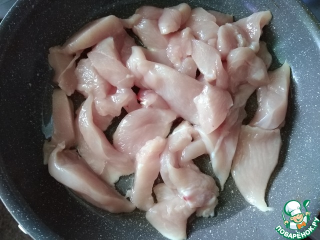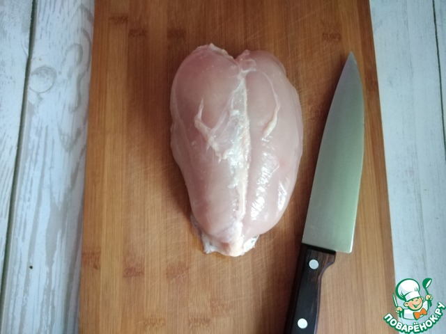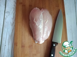 Я взяла куриную грудку от целой курицы. Сняла с неё кожу и разделала на филе. Филе нарезала на кусочки, произвольно порезанные (не совсем маленькие).