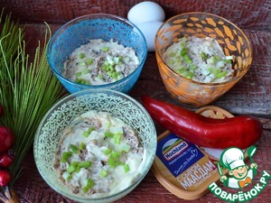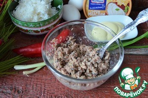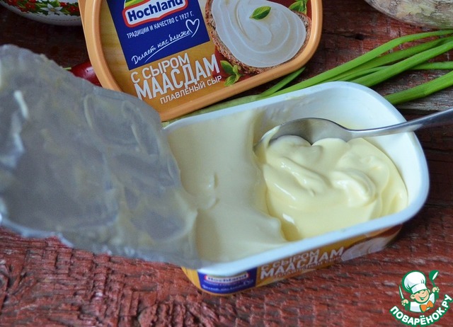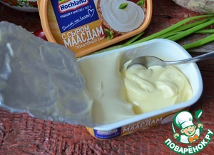 Смешать до однородности майонез и сыр, я использую плавленый сыр с сыром маасдам от ТМ Hochland.