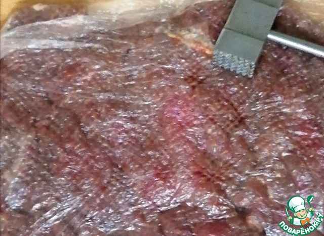 Мясо получилось плотное словно чуть вяленое, при этом очень мягкое, за счёт предварительного маринования.