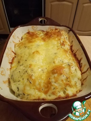 Заливаем форму с картофелем, присыпаем сверху ещё немного тимьяном и ставим в духовку, выставив т-180 С на 40 минут.