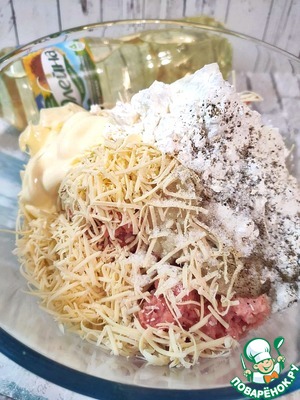 В миску выложите фарш, лук, сыр, майонез, крахмал. Добавьте по вкусу соль и свежемолотый чёрный перец. Тщательно всё перемешайте.