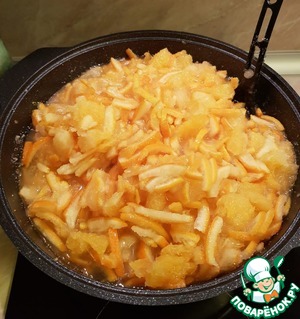 Шкурки нарезать длинными полосочками по 3-4 см длиной, добавить их в кастрюлю с апельсинами и аккуратно перемешать.