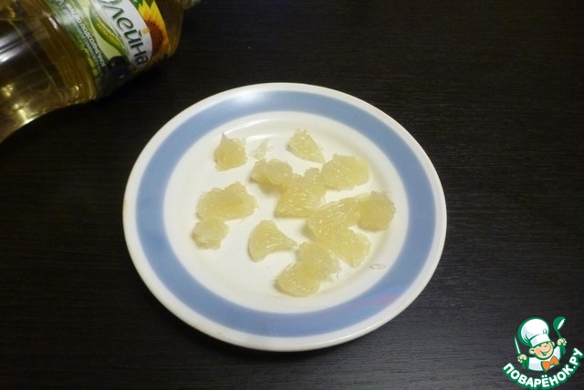 Не крупный грейпфрут разрезать пополам и отделить мякоть от пленок. Разобрать на кусочки. Сок собрать и добавить в заправку для салата.