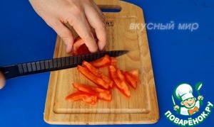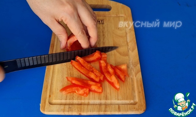 Помидоры разрезать на четвертинки и вынуть семена вместе соком, нарезать соломкой.
