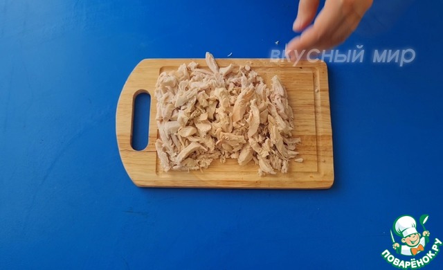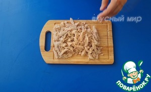 Мясо курицы заранее отварить, остудить и разделить на волокна или нарезать соломкой.