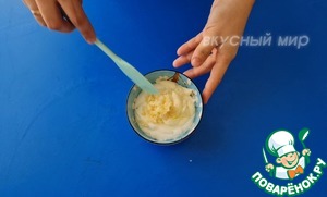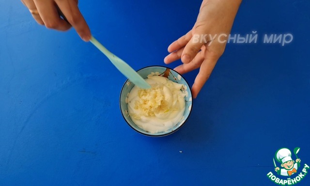 В майонез добавить чеснок (натереть на терке), перемешать.
