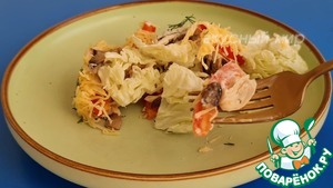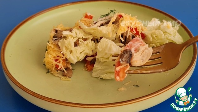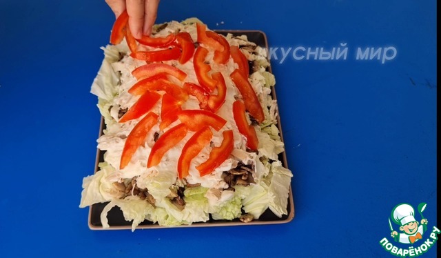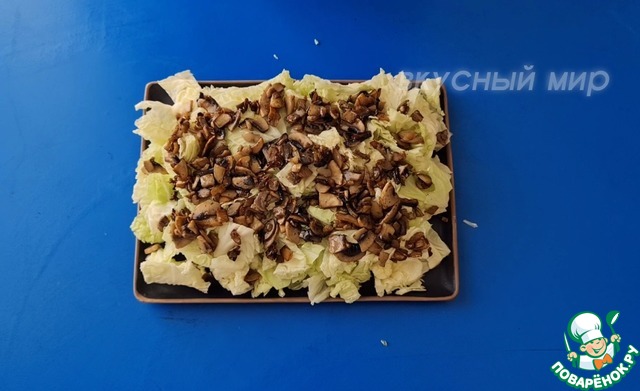 Пекинскую капусту выложить на блюдо, сверху майонез (я заранее выложила в кондитерский мешок), затем сверху шампиньоны