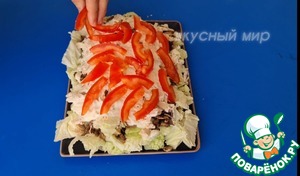 Сверху майонез, затем куриное мясо, опять майонез, затем помидоры