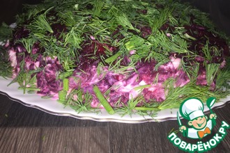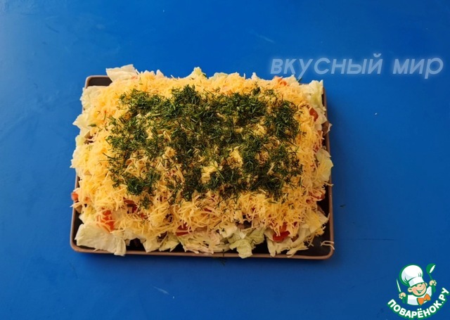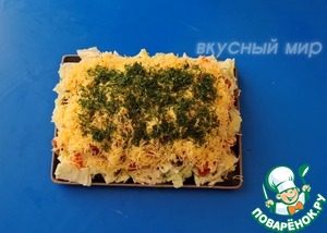 Сверху еще майонез, затем натертый на мелкой терке сыр и верх украсить укропом.