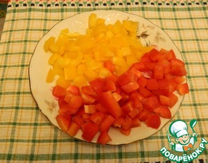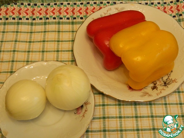Перец болгарский лучше взять разных цветов, почистим лук.