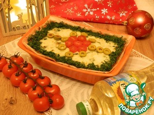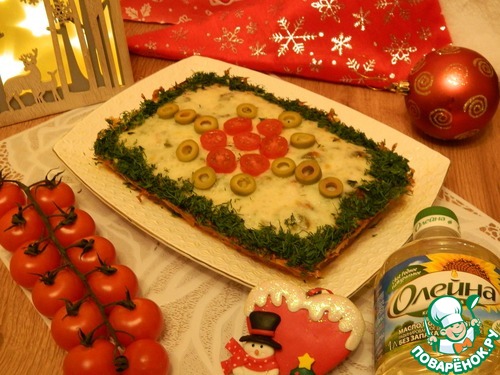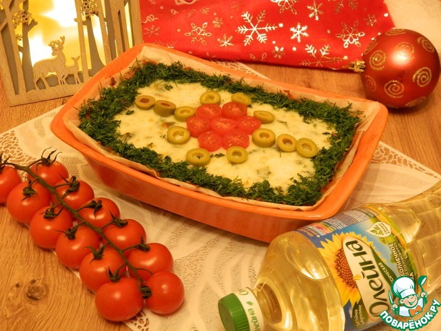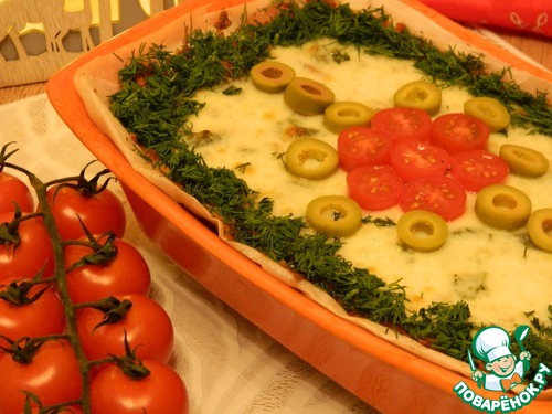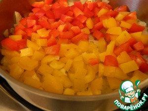 Сверху на капусту уложим начинку из пережаренного лука, перца болгарского, присыпим петрушкой.