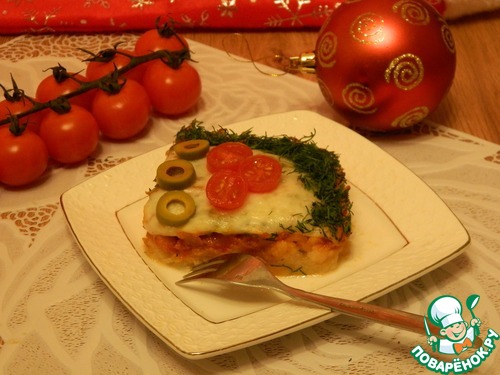 В форму выложим пюре из капусты. Я как всегда перестраховалась и застелила ее пергаментом, чтобы проще было вынимать из формы на блюдо, это делать не нужно, просто смажьте форму маслом.