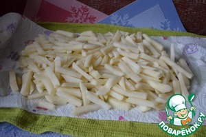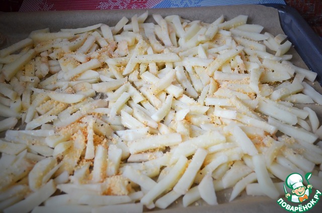 Разложить картофель на противень, застеленный листом пергамента и посыпать панировочными сухарями и перцем, полить растительным маслом, перемешать.