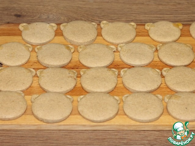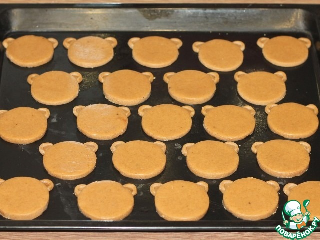 16. Разогреваем духовку до t 180 С и ставим противень с заготовками. Выпекаем пряники 5-7 минут. Немного охлаждаем пряники и аккуратно снимаем с противня. Поддеваем вначале острым ножиком ушки, а затем мордочку. Если отлетело ухо, приклеиваете его к мордочке белком и в духовку на 1 минуту.