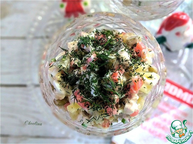 Выложив Оливье в креманки, я верх салата присыплю мелко порезанным укропом, совсем немного, чтобы он не перебивал вкус основных продуктов.