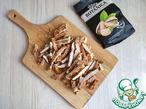 Филе куриной грудки разрезать вдоль и слегка отбить. Лист пергамента смазать тонким слоем растительного масла, присыпать пряностями и солью. Поместить филе грудки на лист пергамента, второй частью листа прикрыть филе и слегка придавить. Можно воспользоваться готовыми листами для приготовления филе курицы для салатов.