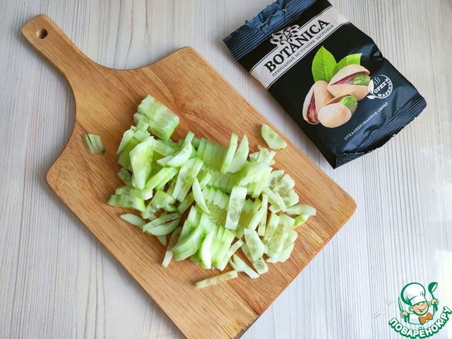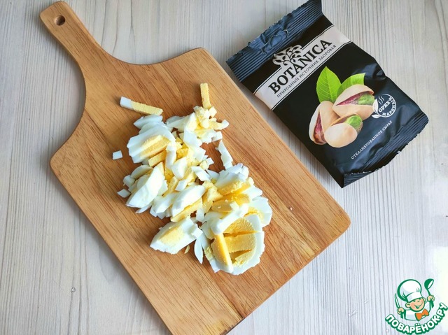 Фисташки ТМ "Botanica" измельчить в не крупную крошку. В миску добавить все составляющие салата, добавить по вкусу соль. Заправить салат майонезом.