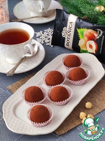 Далее достать холодное тесто, сформовать круглые лепешки, на середину каждой добавить фундук ТМ "Botanica", сформовать круглый шарик массой примерно 30 гр. Каждый шарик присыпать какао-порошком. Десерт перед подачей убрать в холодильник, лучше в морозильную камеру на 15-20 мин. Подавать охлажденным к горячему чаю или кофе.